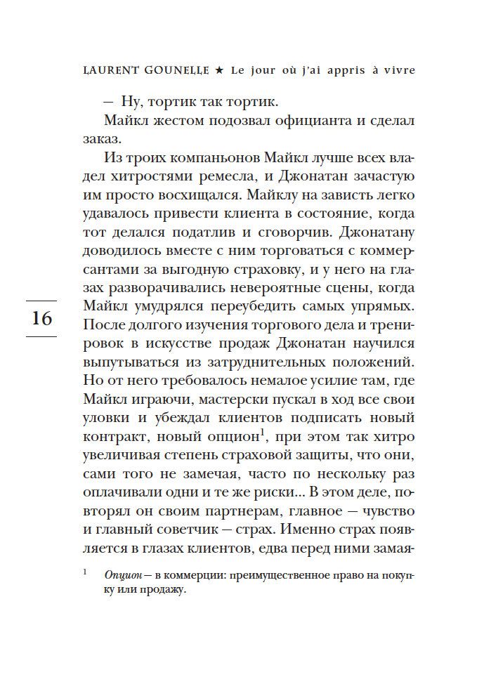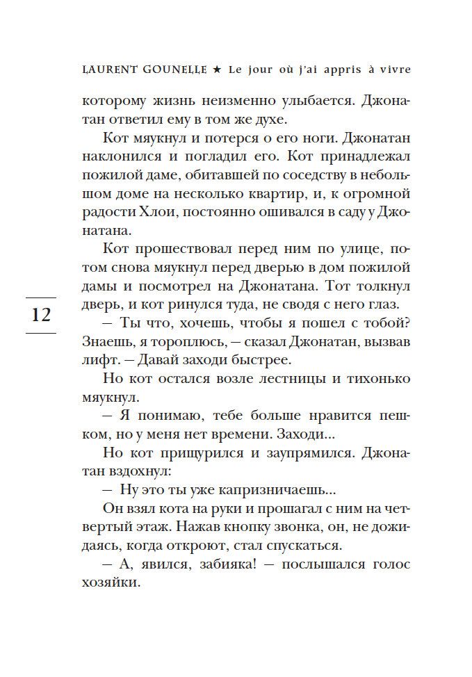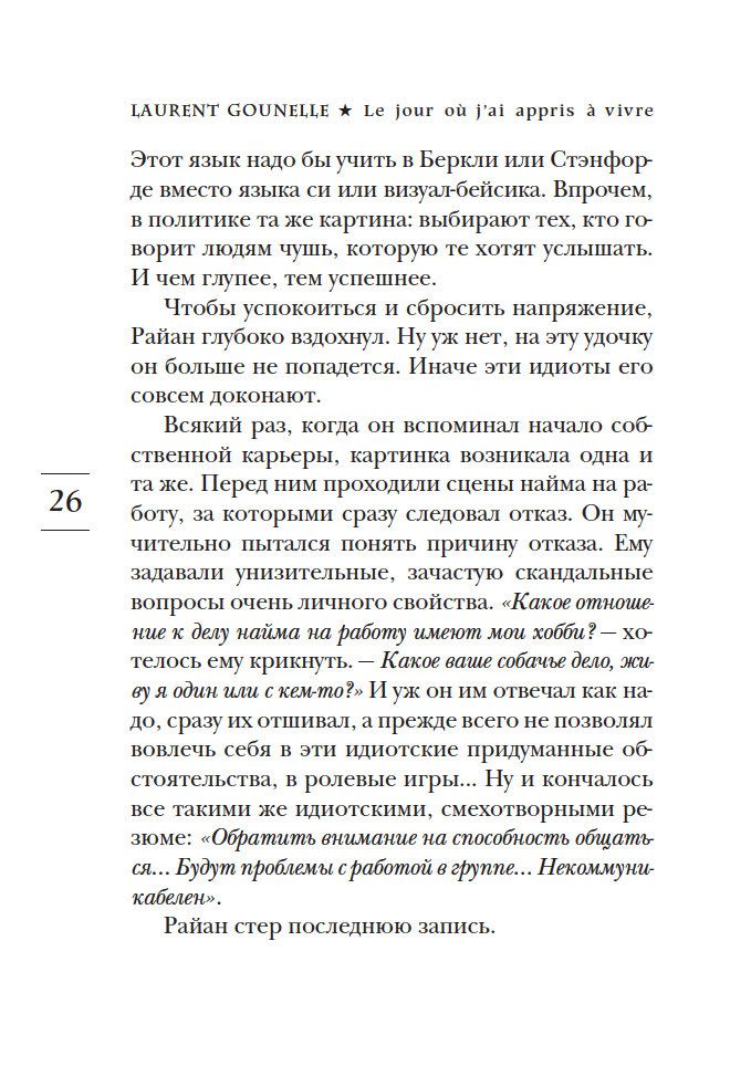 Лоран Гунель входит в пятерку самых популярных беллетристов Франции. Его новая книга называется "День, когда я научился жить". Представьте, что в один прекрасный день цыганка, посмотрев на вашу ладонь, испуганно замолкает. И лишь после настойчивых просьб вы добиваетесь от нее ответа. Звучит он довольно страшно: "Ты скоро умрешь". Для Джонатана, героя романа Гунеля, мир совершенно меняется. И хотя никаких болезней врачи у него не находят, он решает провести несколько недель среди гор и холмов на берегу океана. Впервые он никуда не спешит. В поисках ответа на вечные вопросы о смысле жизни Джонатан заново знакомится с самим собой. Встречи, странствия, приключения и самопознание в корне меняют и его видение жизни, и саму жизнь ...