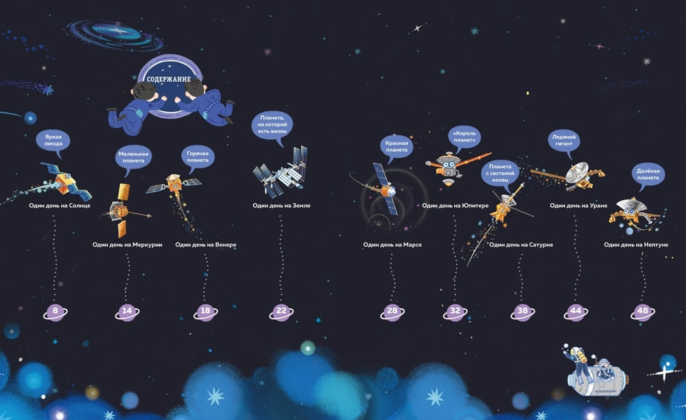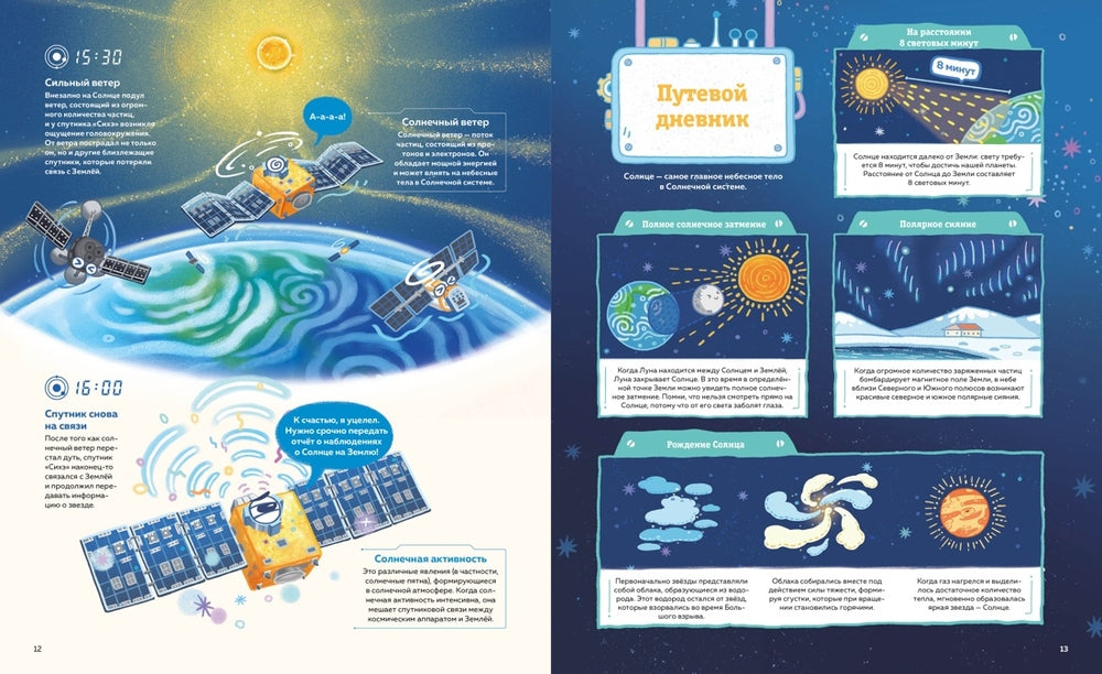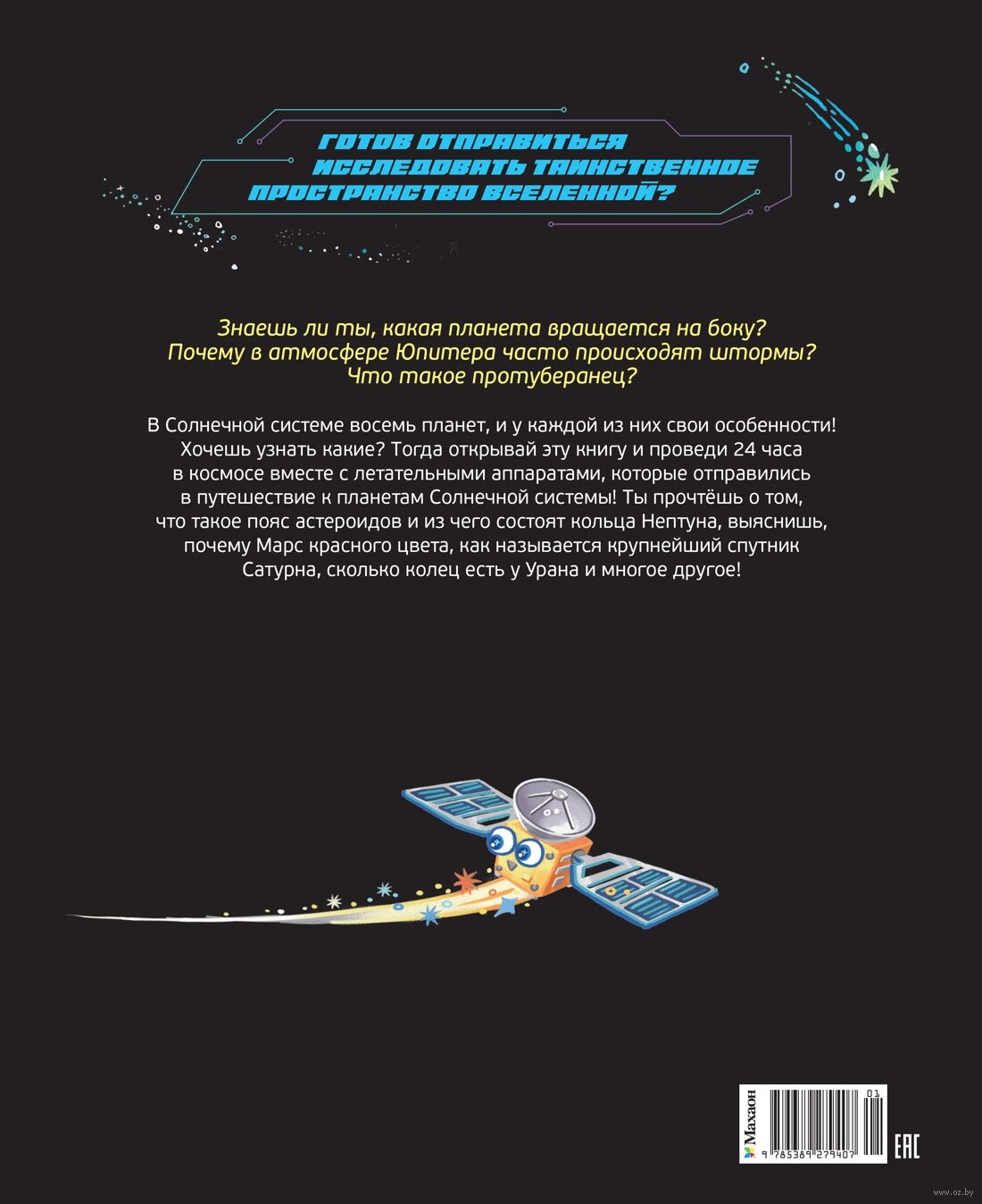 Знаешь ли ты, какая планета вращается на боку? Почему в атмосфере Юпитера часто происходят штормы? Что такое протуберанец? В Солнечной системе восемь планет, и у каждой из них свои особенности! Хочешь узнать, какие? Тогда открывай эту книгу и проведи 24 часа в космосе вместе с летательными аппаратами, которые отправились в путешествие к планетам Солнечной системы!