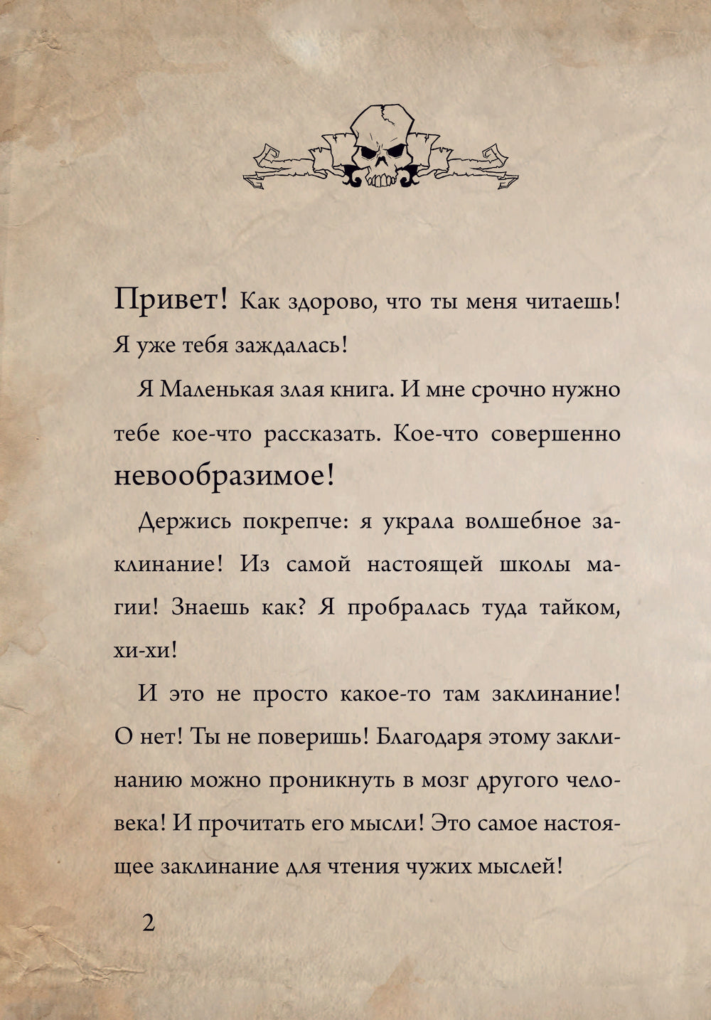 Секрет успеха серии в том, что книга ведёт живой, юмористический диалог с читателем, рассказывает ему страшные истории и приглашает в авантюрное приключение. Чтобы пройти всю книгу до конца (принимая решения на сюжетных развилках и переходя по разным страницам не по порядку), нужно разгадать немало загадок и головоломок, которые развивают внимание и мышление. В этот раз злюка решила проверить, сможет ли она с помощью заклинания проникать в мозг других людей и читать их мысли... Чем закончится этот эксперимент?