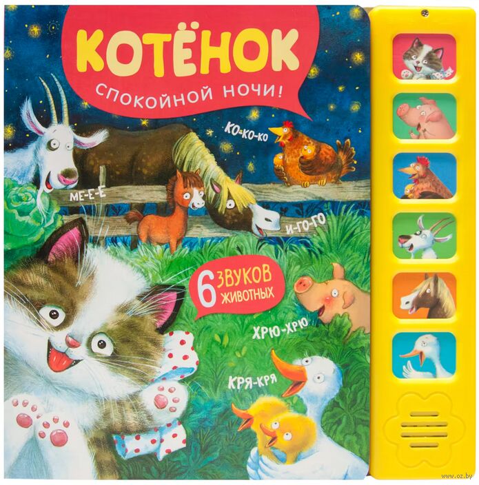 Эта замечательная звуковая книга с волшебными иллюстрациями Л. Ереминой и добрыми стихами обязательно понравится малышу. Вместе с забавным котенком он пожелает: "Спокойной ночи!" – лошадке, утятам, свинке, курице и другим домашним животным. Нажимая на кнопки, ребенок сможет послушать 6 разных звуков: кряканье утят, ржание лошадки и другие.
