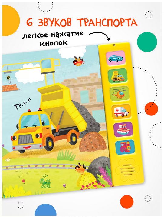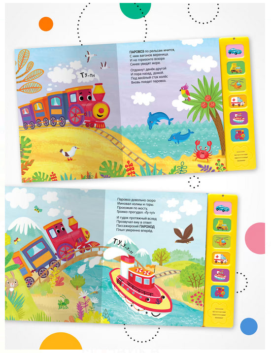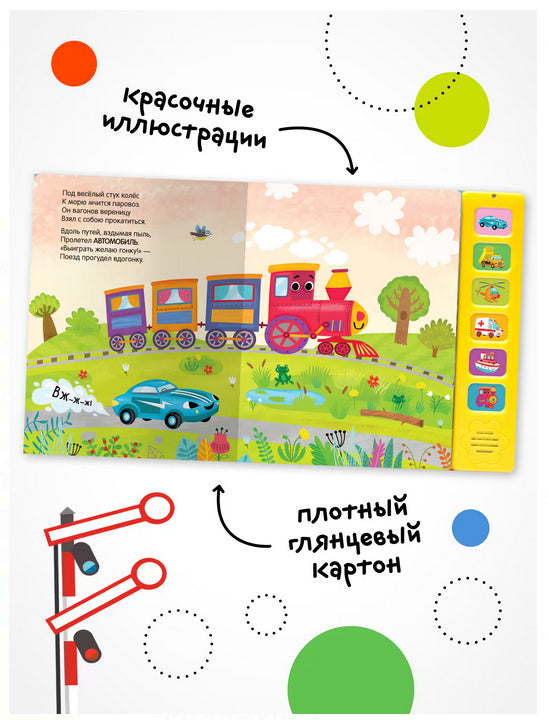 Ту-ту! Вж-ж-ж! Дети обожают звуковые книги – ведь так интересно нажимать на кнопки и слушать разные звуки. Книга "Паровоз и его друзья" с красочными иллюстрациями Анны Гузь и добрыми забавными стихами расскажет о приключениях паровозика, который мчится к морю. В пути вместе с веселым паровозом малыш повстречает его друзей: гоночную машину, пароход, машину скорой помощи, самосвал и вертолет. В книге 6 звуковых кнопок, нажимая на которые, ребенок услышит гудок парохода, сирену машины скорой помощи и другие звуки транспорта.