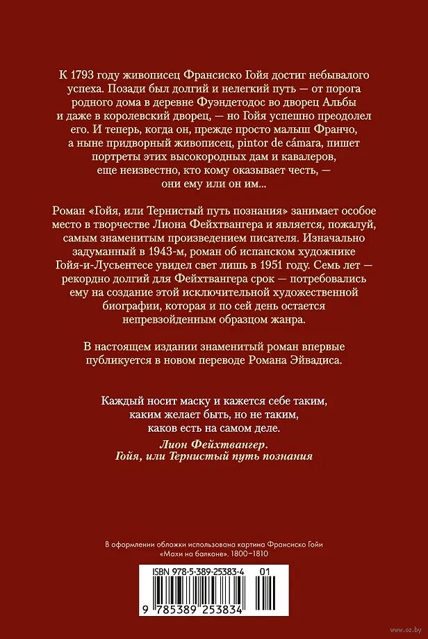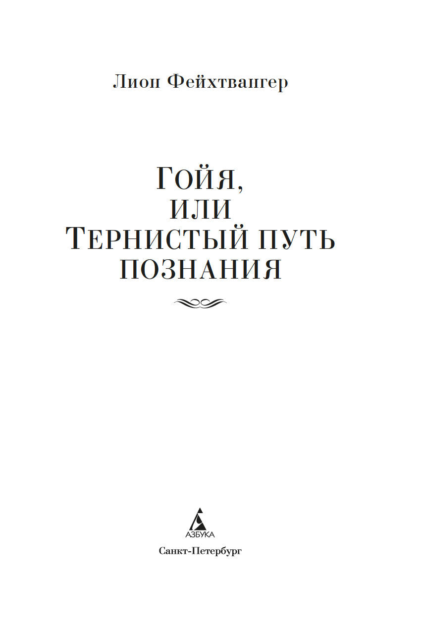 Роман "Гойя, или Тернистый путь познания" занимает особое место в творчестве Лиона Фейхтвангера и является, пожалуй, самым знаменитым произведением писателя. Изначально задуманный в 1943-м, роман об испанском художнике Гойя-и-Лусьентесе увидел свет лишь в 1951 году. Семь лет – рекордно долгий для Фейхтвангера срок – потребовались ему на создание этой исключительной художественной биографии, которая и по сей день остается непревзойденным образцом жанра.