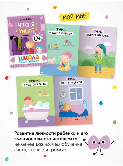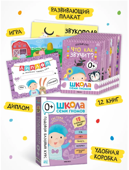 Набор "Школа Семи Гномов. Базовый курс 0+", 12 книжек + плакат, игра и диплом. Комплект включает в себя книги "Что как звучит", "День и ночь", "Кто что делает?", "Квадратик и кружок", "Мелкая моторика", "Самая первая книжка", "Кто как говорит", Цветные картинки", "Первые цвета", "Первые потешки", "Мои любимые игрушки", "Что я умею". Часть этих книжек направлена на развитие когнитивных способностей ребенка: познавательный интерес, умение думать, анализировать и делать выводы. Другая часть книжек посвящена окружающему миру, и знакомит ребенка с природой и миром людей. Школа Семи Гномов – это система, а не набор книг. Она выстроена таким образом, чтобы ребёнок получил необходимые знания в правильный момент. Поэтому все книги в Школе Семи Гномов имеют четкую возрастную адресацию и разработаны строго с учетом возрастных возможностей ребенка. Но самое важное, чтобы занятия с ребенком давали результат и приносили радость. Поэтому все задания выстроены от простого к сложному и следуют принципу «развитие через игру». Заниматься с ребенком может любой взрослый, специальных знаний и опыта не требуется. Родительская страничка в каждой книге подскажет, что, как и почему нужно развивать в данном возрасте. А еще в Школе Семи Гномов очень сложно заблудиться, ведь каждому возрасту соответствует свой цвет и свой герой. В течение всего обучения ребенка сопровождают семь Гномов – персонажи, списанные с детей соответствующего возраста. Самых маленьких сопровождает фиолетовый цвет и гномик Бантик. Заниматься с грудным ребенком не только можно, но и нужно! Первый год жизни новорожденных — это фундамент формирования его личности. От рождения до года стремительно развиваются интеллект и эмоциональная сфера. Книжки в наборе разработаны специально для малышей от 0 до 1 года. Школа семи гномов – это самая популярная домашняя система образования от рождения до школы. Занятия направлены на изучение грамоты, формирование внимания, логического мышления и речевого развития у дошколят. Годовой курс занятий (12 умных книжек) обучит системному мышлению. Данные комплекты стимулируют раннее развитие, а обучающие программы в них соответствуют стандартам ФГОС. Отдельно можно приобрести активити – интересные задачи и развивашки с наклейками, тренирующие память, логику и речь через игру. А для комплексного развития отдельно представлены мастерские - альбомы с интересными заданиями по рисованию, лепке и другим видам творчества. Благодаря данным рисовашкам малыш научится делать поделки и рисовать. Занимательные сборники и все наборы Школы Семи Гномов позволят ребенку изучать окружающий мир и развиваться всесторонне. «Мозаика kids» — ведущий создатель книг для детей дошкольного возраста. Мы привносим в жизнь ребят и их родителей радость обучения и воспитания. Наша деятельность охватывает развитие и образование маленьких детей. Бренд предлагает богатый выбор детских книг, благодаря которым ребенок познакомится с алфавитом, изучит буквы и цифры, будет развивать моторику и логику, научится решать развивающие головоломки. Все задания сделаны в игровой форме. Для девочек и мальчиков, малышей и дошкольников мы создаем книжки по математике, окружающему миру и т.д. Наша продукция подарочного и познавательного характера — отличный выбор для подарка. Полезным инструментом для вос