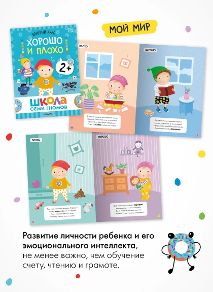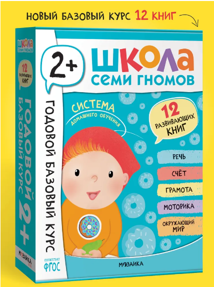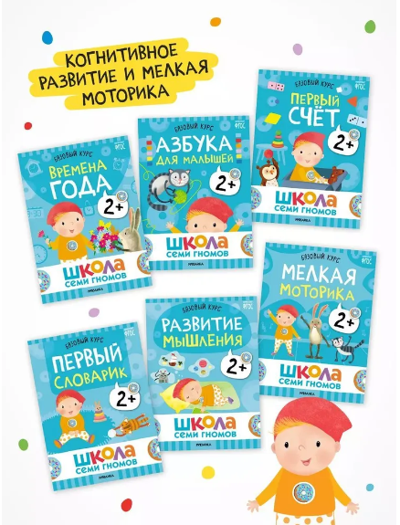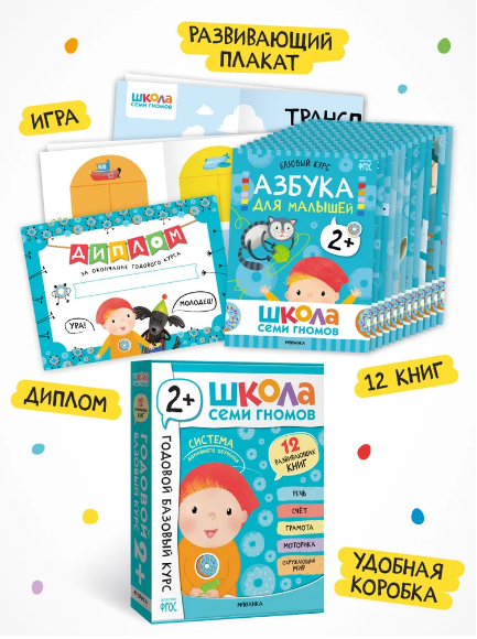 Набор "Школа Семи Гномов. Базовый курс 2+", 12 книжек + плакат, игра и диплом. Комплект включает в себя книги "Времена года", "Азбука для малышей", "Первый счет", "Первый словарик", "Развитие мышления", "Мелкая моторика", "В деревне", "В лесу", "В зоопарке", "Транспорт", "Какие бывают профессии", "Хорошо и плохо". Часть этих книжек направлена на развитие когнитивных способностей ребенка: познавательный интерес, умение думать, анализировать и делать выводы. Другая часть книжек посвящена окружающему миру и знакомит ребенка с природой и миром людей. Школа Семи Гномов – это система, а не набор книг. Она выстроена таким образом, чтобы ребёнок получил необходимые знания в правильный момент. Поэтому все книги в Школе Семи Гномов имеют четкую возрастную адресацию и разработаны строго с учетом возрастных возможностей ребенка. Но самое важное, чтобы занятия с ребенком давали результат и приносили радость. Поэтому все задания выстроены от простого к сложному и следуют принципу «развитие через игру». Заниматься с ребенком может любой взрослый, специальных знаний и опыта не требуется. Родительская страничка в каждой книге подскажет, что, как и почему нужно развивать в данном возрасте. А еще в Школе Семи Гномов очень сложно заблудиться, ведь каждому возрасту соответствует свой цвет и свой герой. В течение всего обучения ребенка сопровождают семь Гномов – персонажи, списанные с детей соответствующего возраста. Двухлетнего ребенка сопровождает голубой цвет и гномик Пончик. Двухлетний ребенок – неутомимый исследователь. На третьем году жизни продолжается интенсивное развитие психической и умственной сфер ребенка. Упражнения для детей от двух до трех лет соответствуют занятиям в ясельной группе детского сада. Задания в книжках сделаны специально для малышей от 2 до 3 лет. Школа семи гномов – это самая популярная домашняя система образования от рождения до школы. Занятия направлены на изучение грамоты, формирование внимания, логического мышления и речевого развития у дошколят. Годовой курс занятий (12 умных книжек) обучит системному мышлению. Данные комплекты стимулируют раннее развитие, а обучающие программы в них соответствуют стандартам ФГОС. Отдельно можно приобрести активити – интересные задачи и развивашки с наклейками, тренирующие память, логику и речь через игру. А для комплексного развития отдельно представлены мастерские - альбомы с интересными заданиями по рисованию, лепке и другим видам творчества. Благодаря данным рисовашкам малыш научится делать поделки и рисовать. Занимательные сборники и все наборы Школы Семи Гномов позволят ребенку изучать окружающий мир и развиваться всесторонне. «Мозаика kids» — ведущий создатель книг для детей дошкольного возраста. Мы привносим в жизнь ребят и их родителей радость обучения и воспитания. Наша деятельность охватывает развитие и образование маленьких детей. Бренд предлагает богатый выбор детских книг, благодаря которым ребенок познакомится с алфавитом, изучит буквы и цифры, будет развивать моторику и логику, научится решать развивающие головоломки. Все задания сделаны в игровой форме. Для девочек и мальчиков, малышей и дошкольников мы создаем книжки по математике, окружающему миру и т.д. Наша продукция подарочного и познавательного характера — отличный выбор для подарка. Полезным инструмент