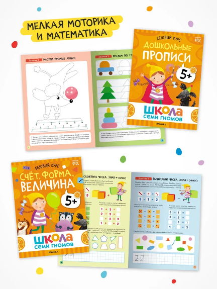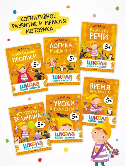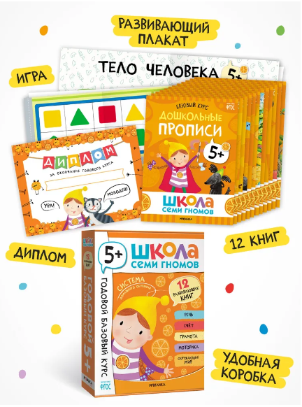 Набор "Школа Семи Гномов. Базовый курс 5+", 12 книжек + плакат, игра и диплом. Комплект включает в себя книги "Дошкольные прописи", "Логика, мышление", "Развитие речи", "Счет, форма, величина", "Уроки грамоты", "Время, пространство", "География для малышей", "Мир животных", "Тайны природы", "Как перейти дорогу", "Московский Кремль" и "Хорошие привычки". Часть этих книжек направлена на развитие когнитивных способностей ребенка: познавательный интерес, умение думать, анализировать и делать выводы. Другая часть книжек посвящена окружающему миру и знакомит ребенка с природой и миром людей. Школа Семи Гномов – это система, а не набор книг. Она выстроена таким образом, чтобы ребёнок получил необходимые знания в правильный момент. Поэтому все книги в Школе Семи Гномов имеют четкую возрастную адресацию и разработаны строго с учетом возрастных возможностей ребенка. Но самое важное, чтобы занятия с ребенком давали результат и приносили радость. Поэтому все задания выстроены от простого к сложному и следуют принципу «развитие через игру». Заниматься с ребенком может любой взрослый, специальных знаний и опыта не требуется. Родительская страничка в каждой книге подскажет, что, как и почему нужно развивать в данном возрасте. А еще в Школе Семи Гномов очень сложно заблудиться, ведь каждому возрасту соответствует свой цвет и свой герой. В течение всего обучения ребенка сопровождают семь Гномов – персонажи, списанные с детей соответствующего возраста. Пятилетнего ребенка сопровождает оранжевый цвет и гномик Долька. Пятилетний малыш испытывает огромную потребность в познании окружающего мира. Упражнения для детей от пяти до шести лет соответствуют занятиям в старшей группе детского сада и направлены на подготовку будущего первоклассника к 1 классу. Задания в книжках сделаны специально для дошкольников от 5 до 6 лет. Школа семи гномов – это самая популярная домашняя система образования от рождения до школы. Занятия направлены на изучение грамоты, формирование внимания, логического мышления и речевого развития у дошколят. Годовой курс занятий (12 умных книжек) обучит системному мышлению. Данные комплекты стимулируют раннее развитие, а обучающие программы в них соответствуют стандартам ФГОС. Отдельно можно приобрести активити – интересные задачи и развивашки с наклейками, тренирующие память, логику и речь через игру. А для комплексного развития отдельно представлены мастерские - альбомы с интересными заданиями по рисованию, лепке и другим видам творчества. Благодаря данным рисовашкам малыш научится делать поделки и рисовать. Занимательные сборники и все наборы Школы Семи Гномов позволят ребенку изучать окружающий мир и развиваться всесторонне. «Мозаика kids» — ведущий создатель книг для детей дошкольного возраста. Мы привносим в жизнь ребят и их родителей радость обучения и воспитания. Наша деятельность охватывает развитие и образование маленьких детей. Бренд предлагает богатый выбор детских книг, благодаря которым ребенок познакомится с алфавитом, изучит буквы и цифры, будет развивать моторику и логику, научится решать развивающие головоломки. Все задания сделаны в игровой форме. Для девочек и мальчиков, малышей и дошкольников мы создаем книжки по математике, окружающему миру и т.д. Наша продукция подарочного и познавательного характера — от
