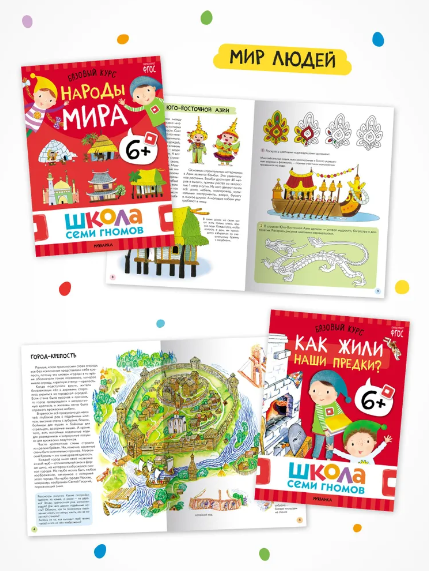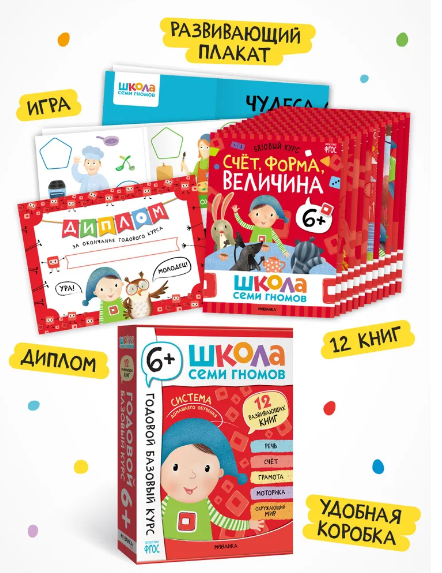 Набор "Школа Семи Гномов. Базовый курс 6+", 12 книжек + плакат, игра и диплом. Комплект включает в себя книги "Логика, мышление", "Дошкольные прописи", "Счет, форма, величина", "Развитие речи", "Уроки грамоты", "Время, пространство", "Экология для малышей", "Малышам об эволюции", "Законы природы", "Как жили наши предки", "Народы мира" и "Уроки этики". Часть этих книжек направлена на развитие когнитивных способностей ребенка: познавательный интерес, умение думать, анализировать и делать выводы. Другая часть книжек посвящена окружающему миру и знакомит ребенка с природой и миром людей. Школа Семи Гномов – это система, а не набор книг. Она выстроена таким образом, чтобы ребёнок получил необходимые знания в правильный момент. Поэтому все книги в Школе Семи Гномов имеют четкую возрастную адресацию и разработаны строго с учетом возрастных возможностей ребенка. Но самое важное, чтобы занятия с ребенком давали результат и приносили радость. Поэтому все задания выстроены от простого к сложному и следуют принципу «развитие через игру». Заниматься с ребенком может любой взрослый, специальных знаний и опыта не требуется. Родительская страничка в каждой книге подскажет, что, как и почему нужно развивать в данном возрасте. А еще в Школе Семи Гномов очень сложно заблудиться, ведь каждому возрасту соответствует свой цвет и свой герой. В течение всего обучения ребенка сопровождают семь Гномов – персонажи, списанные с детей соответствующего возраста. Шестилетнего ребенка сопровождает красный цвет и гномик Кубик. Седьмой год жизни – финишная прямая в подготовке малыша к школе. Шестилетний ребенок уже готов учить материал, необходимый для успешного старта в 1 классе. Упражнения для детей от шести до семи лет соответствуют занятиям в подготовительной группе в детском саду и направлены на подготовку будущего первоклассника к школе. Задания сделаны специально для дошкольников от 6 до 7 лет. Школа семи гномов – это самая популярная домашняя система образования от рождения до школы. Занятия направлены на изучение грамоты, формирование внимания, логического мышления и речевого развития у дошколят. Годовой курс занятий (12 умных книжек) обучит системному мышлению. Данные комплекты стимулируют раннее развитие, а обучающие программы в них соответствуют стандартам ФГОС. Отдельно можно приобрести активити – интересные задачи и развивашки с наклейками, тренирующие память, логику и речь через игру. А для комплексного развития отдельно представлены мастерские - альбомы с интересными заданиями по рисованию, лепке и другим видам творчества. Благодаря данным рисовашкам малыш научится делать поделки и рисовать. Занимательные сборники и все наборы Школы Семи Гномов позволят ребенку изучать окружающий мир и развиваться всесторонне. «Мозаика kids» — ведущий создатель книг для детей дошкольного возраста. Мы привносим в жизнь ребят и их родителей радость обучения и воспитания. Наша деятельность охватывает развитие и образование маленьких детей. Бренд предлагает богатый выбор детских книг, благодаря которым ребенок познакомится с алфавитом, изучит буквы и цифры, будет развивать моторику и логику, научится решать развивающие головоломки. Все задания сделаны в игровой форме. Для девочек и мальчиков, малышей и дошкольников мы создаем книжки по математике, окружающему мир