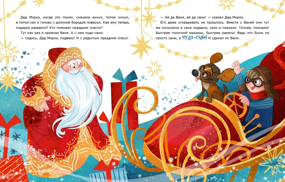 Ваня – фантазёр и выдумщик. Изобретатель! В своём блокноте он рисовал множество разных необычных вещей – полезных и нужных. А однажды, в канун Нового года, придумал нечто особенное – чудо-сани, которые могли ездить как машина, плавать и даже летать!