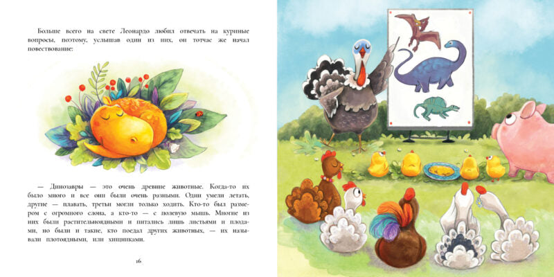 Однажды в обычном курятнике появилось очень необычное яйцо, из которого вылупился… динозаврик! Что же делать с этим неизвестным существом? Хорошо, что по соседству живёт умный индюк Леонардо. Он рассказал курам много интересного о динозаврах. Давай и мы с тобой послушаем эту историю и насладимся иллюстрациями Ольги Бадулиной. Эта книга Анны Федуловой входит в серию “Детская художественная литература”.