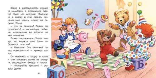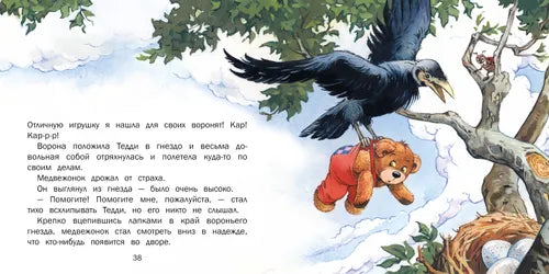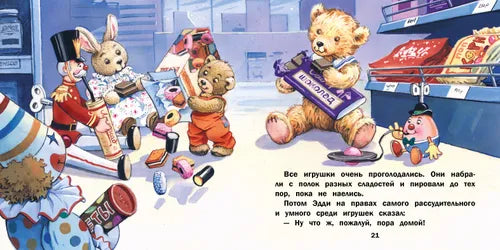 A small, restless Teddy bear cub lives in a toy store. He has many friends - Eddie the bear, Dolly the doll, Polly the bunny, the clown and the tin soldier. They constantly run away from the store and get into different stories. In this book, the toys will first go on a journey on a train, and then baby Teddy will be kidnapped by a huge crow, and his friends will have to help him out! For children up to three years old