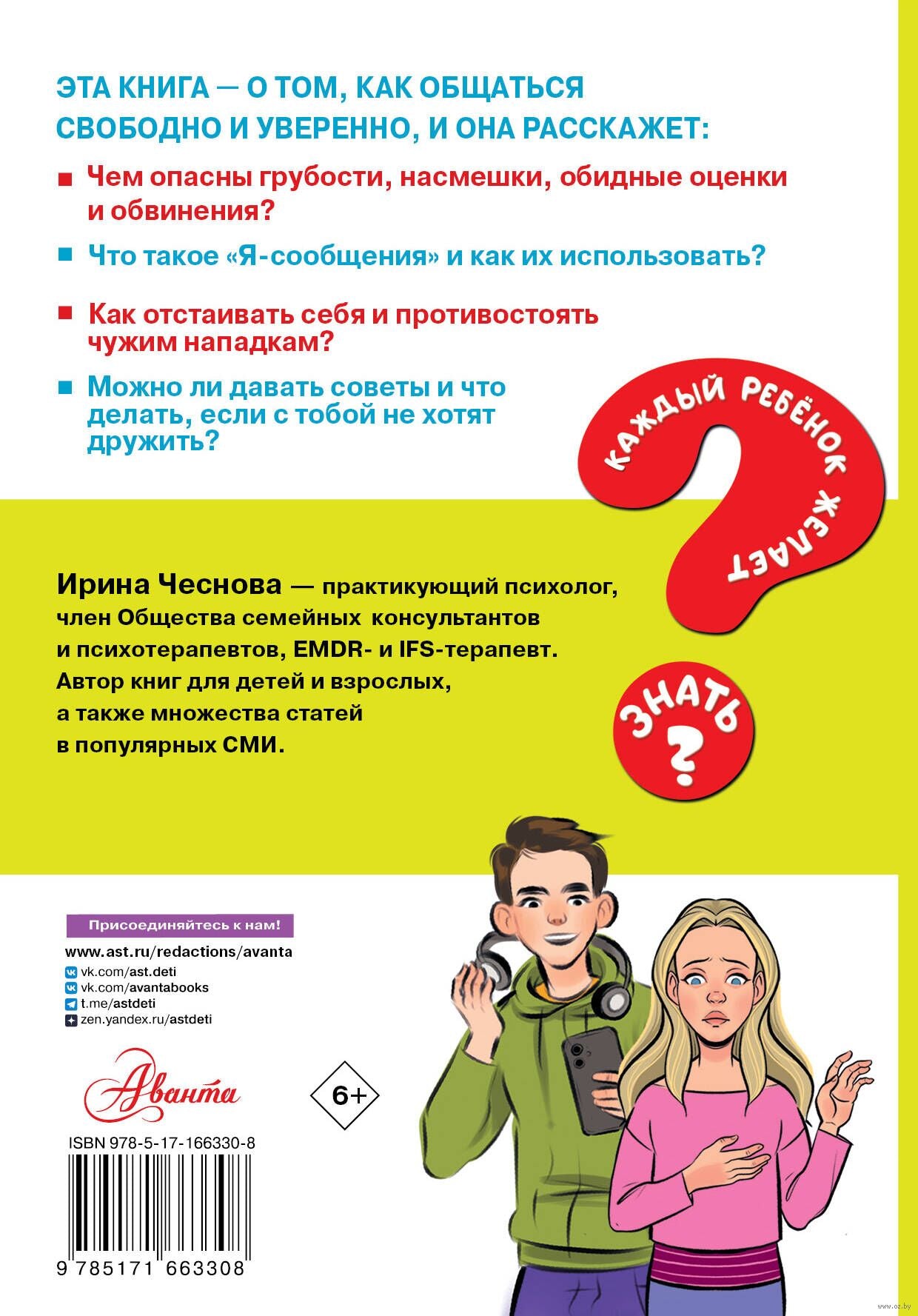 В своей новой книге известный психолог Ирина Чеснова раскроет юным читателям – младшим и средним школьникам – все секреты общения. Книга подскажет, как быть доброжелательным, но твердым, отстаивать свои интересы, реагировать на грубости, разрешать конфликты, говорить "нет" – в общем, как общаться свободно и уверенно, оставаясь при этом собой. А также как развивать отношения с тем, кто нравится, и не бояться говорить о том, что на душе.