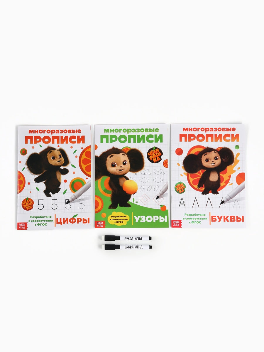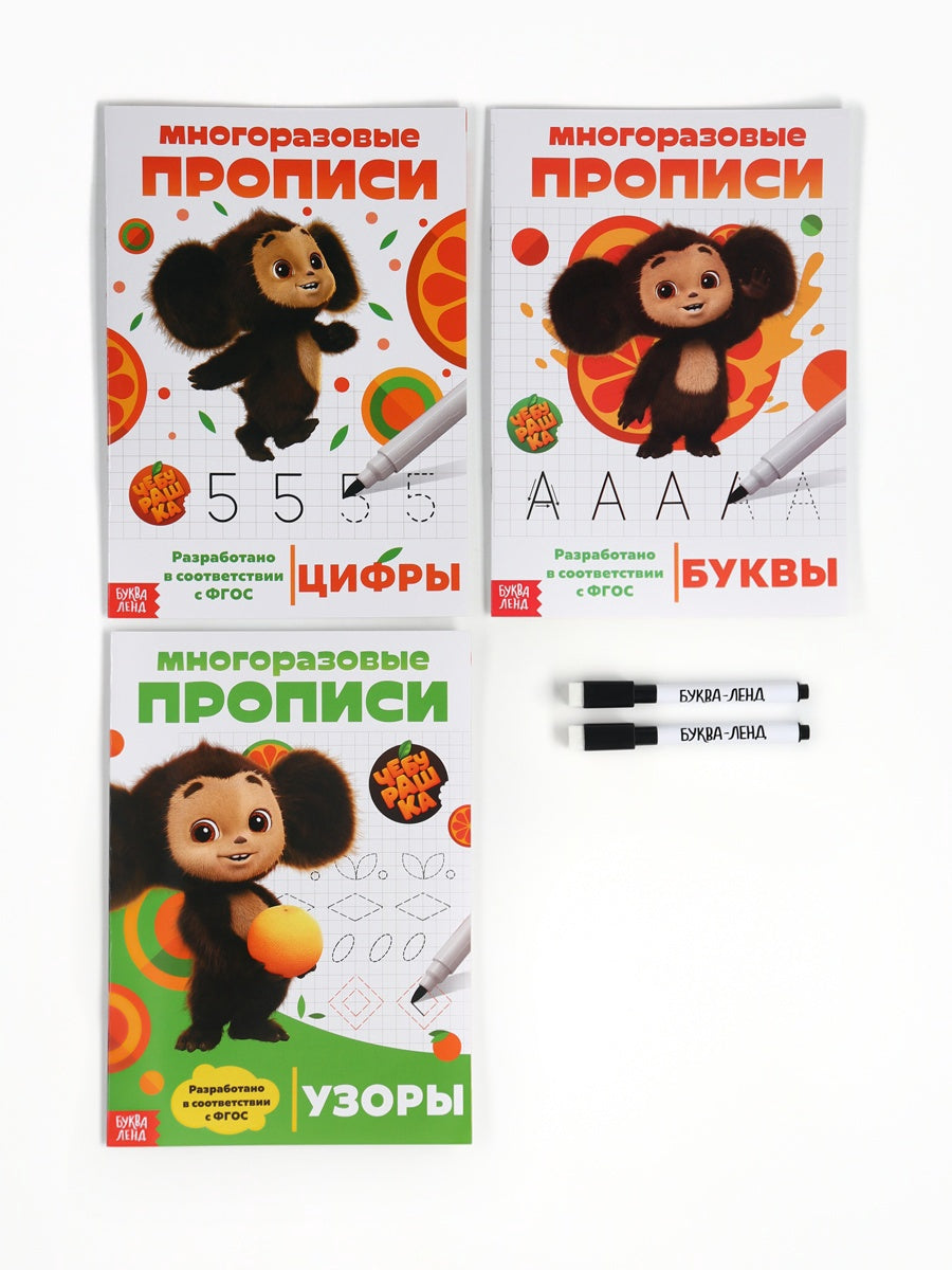 Прописи многоразовые набор Учимся вместе с Чебурашкой, 3 шт., 2 маркера, Чебурашка - [купить в сша] - [Bookvoed US]