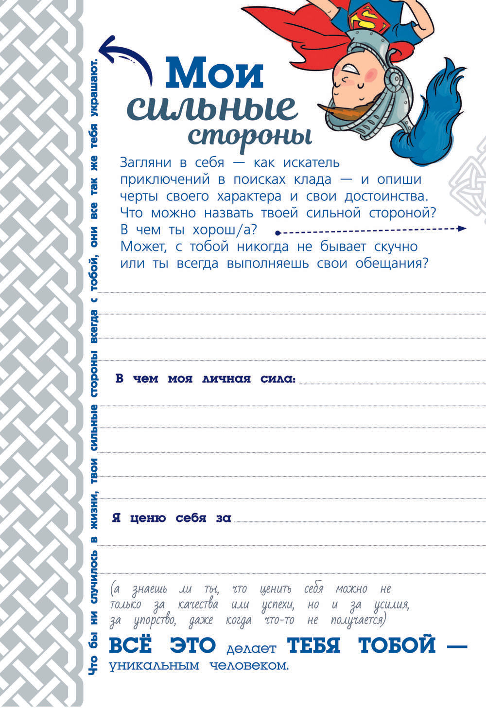 Психологический дневник поможет школьнику видеть свои уникальные особенности и черты, доверять чувствам, ставить верные цели и поддерживать себя, когда трудно. Заполняя его, он лучше поймёт себя и других, а также узнает много интересного и полезного: как верить в себя и справляться с неудачами, проявлять уважение и ответственность, победить страхи и развеять скуку, как позаботиться о своей безопасности, свободно и уверенно общаться и раскрыть свой потенциал.