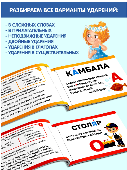 Карточки «Ударения. Учимся говорить правильно!» — это набор из 6 книг по 20 страниц, созданный для детей от 6 лет. Эти книги помогают освоить правильное произношение слов и улучшить речь, превращая обучение в увлекательную игру.
