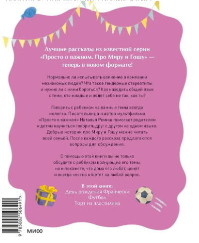 Обсуждать с ребёнком на важные темы всегда нелегко. Писательница и автор мультфильма «Просто о важном» Наталья Ремиш помогает родителям и детям научиться говорить друг с другом на одном языке. Добрые истории про Миру и Гошу можно читать всей семьёй. После каждого рассказа предлагаются вопросы для обсуждения.