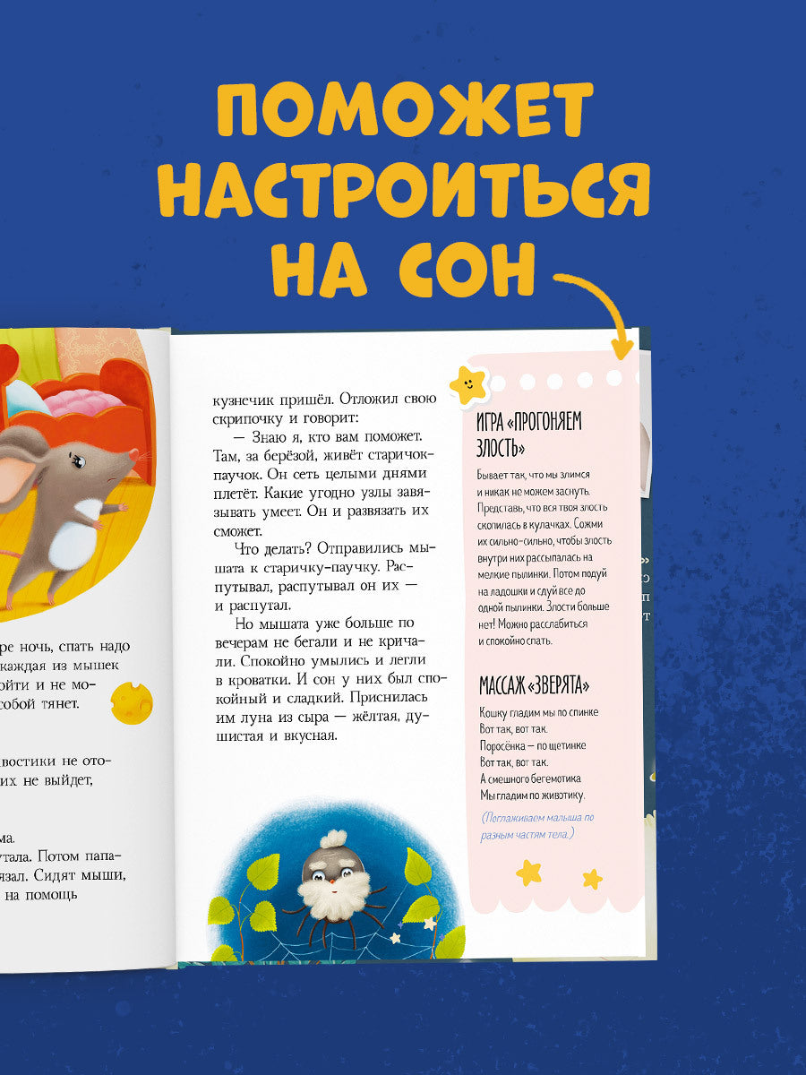 Главы со сказками сопровождают простые психологические упражнения и тактильные игры. Вы будете делать массаж, изображая капающий дождик, или рисовать на ладошках, нежно расслабляя малыша и помогая ему избавляться от негативных мыслей и переключаться с бодрствования на сон.