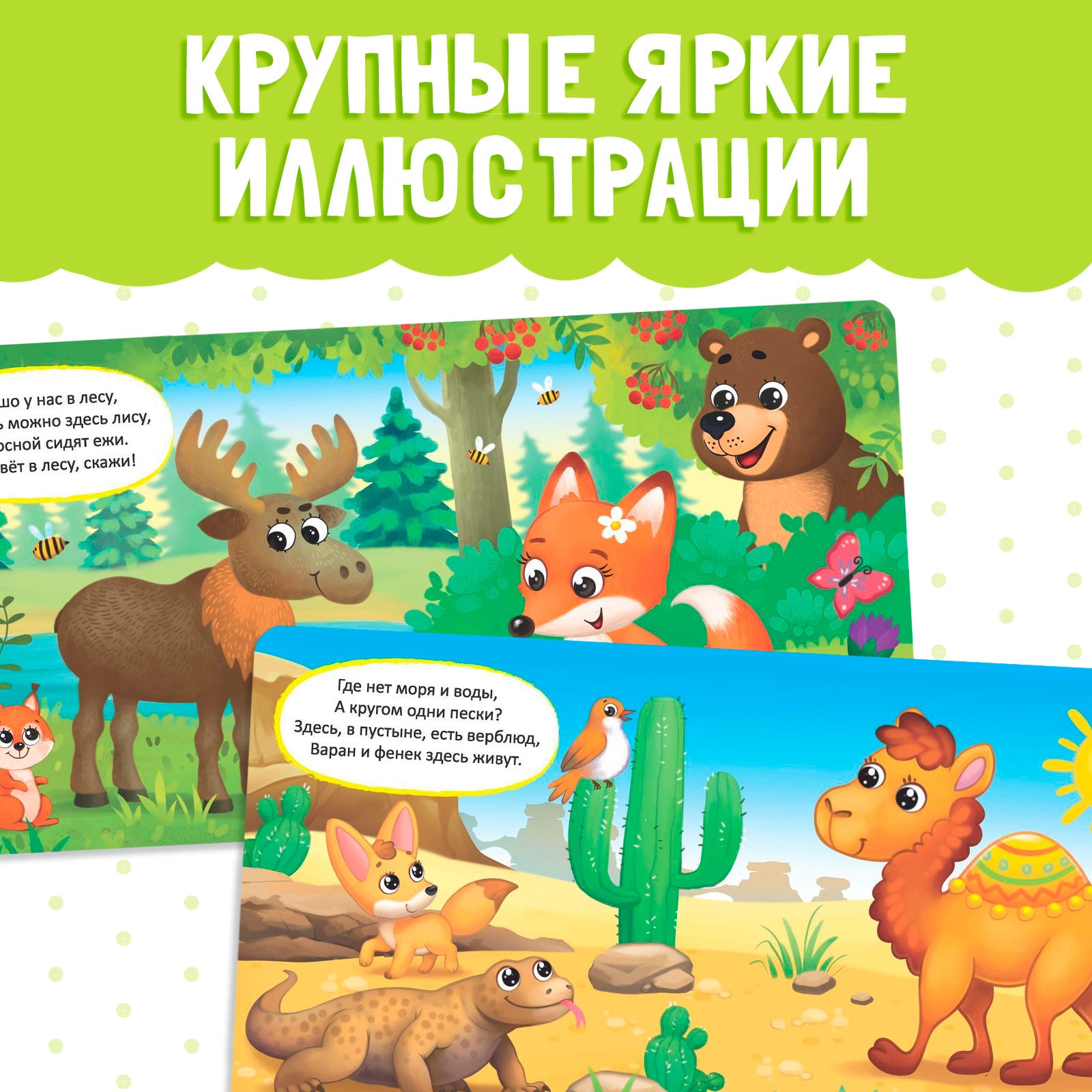 • Яркие иллюстрации помогают ребёнку запомнить животных и развивают зрительное восприятие.