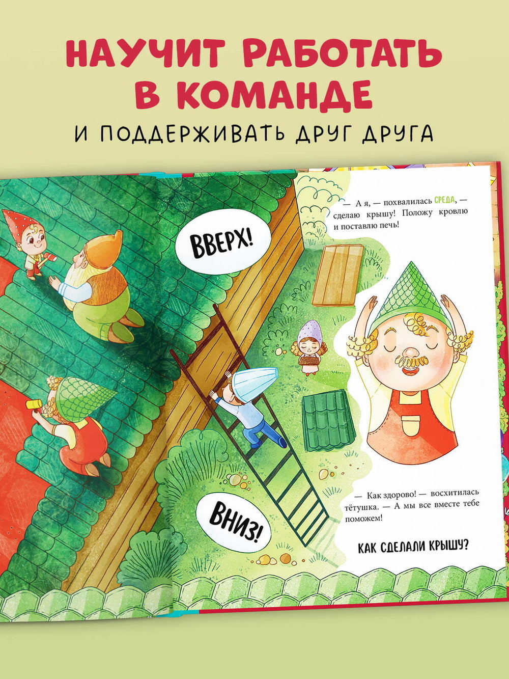 Юный читатель познакомится с симпатичной тетушкой Неделей и ее веселыми помощниками гномиками. Их зовут Понедельник, Вторник, Среда, Четверг, Пятница, Суббота и Воскресенье. У каждого гнома есть любимые шапочка и чашечка определенного цвета, а тетушка Неделя печет им излюбленные пирожки. Однажды гномики решили построить дом. Смогут ли они разделить обязанности и выполнить одно общее дело?