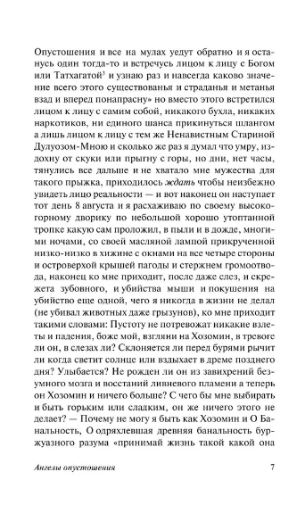 Ангелы опустошения> - книга, которая подводит итоги не только первых двух романов трилогии - и , но и всей буйной, яркой и своеобразной культуры американского битничества. Можно ли удержать в себе тишину высокогорных вершин, снова спустившись в шум и сутолоку городов? Можно ли сохранить с трудом обретенное внутреннее одиночество, вновь оказавшись в бесконечной круговерти людей, близких и чужих, знакомых и незнакомых? Можно ли, наконец, жить дальше, с каждым днем все острее ощущая, как умирает в тебе дух бунтарства и поиска, - все, что ты годами считал своим подлинным и единственно возможным смыслом жизни? Времена меняются, и вместе с ними меняемся мы. Годы идут, жизненный опыт неумолимо ведет душу к взрослению. И по-другому звучит джаз, и горек вкус алкоголя, и сливаются линии бесчисленных дорог и лица бесчисленных женщин... Что - и зачем - ему делать теперь?