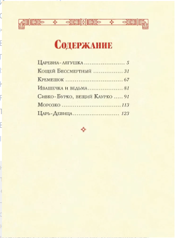 Великолепное подарочное издание в изысканном и стильном оформлении!  В этой книге собрано шесть жемчужин из бесценного наследия устного народного творчества — волшебных русских сказок: «Царевна-лягушка», «Кощей Бессмертный», «Кремешок», «Ивашечка и ведьма», «Сивка-Бурка, вещий Каурко», «Морозко», «Царь-девица». Незабываемые, волнующие образы героев изящно и красочно воссоздал в своих иллюстрациях художник Игорь Егунов.