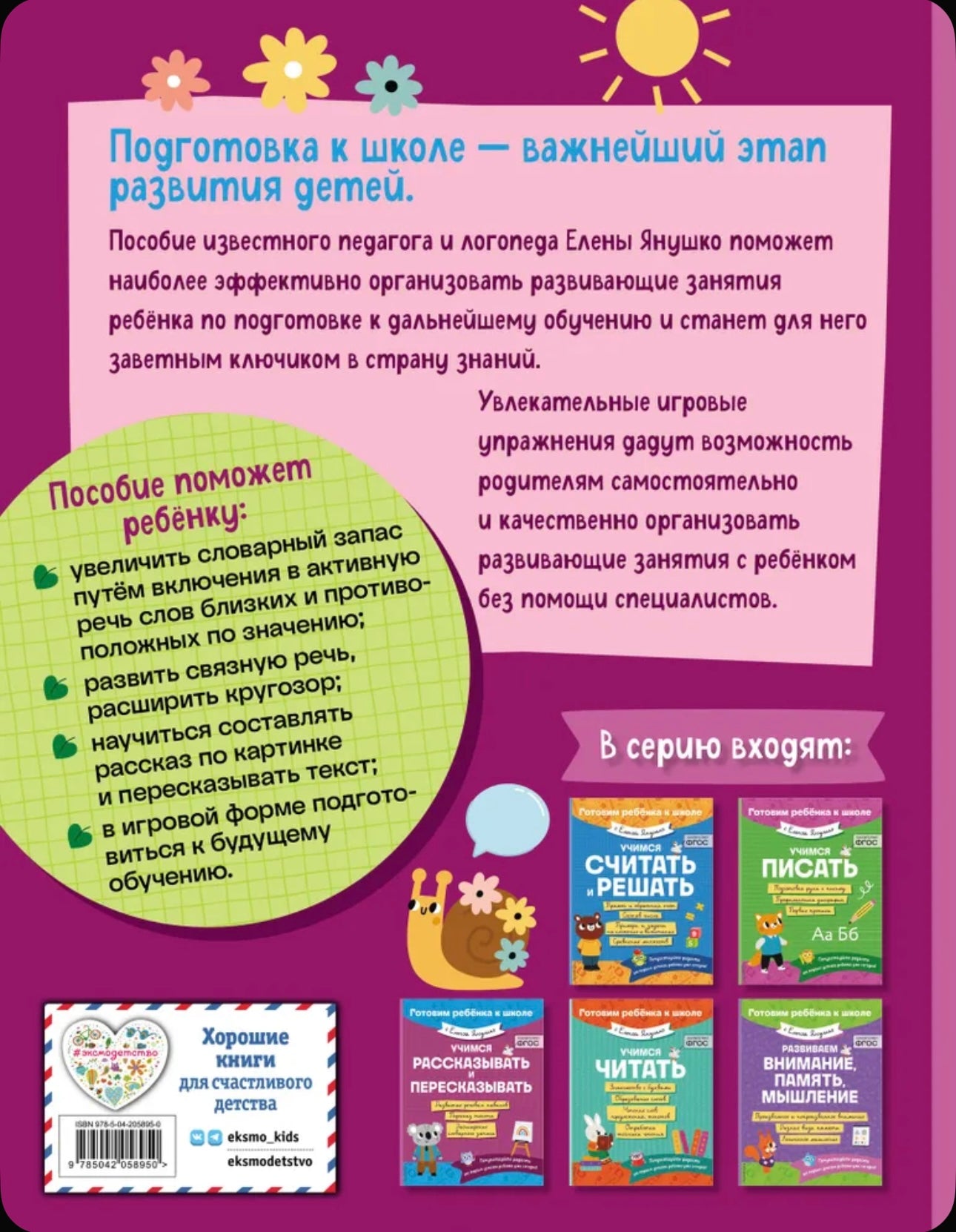Пособие педагога-логопеда Елены Янушко, соответствующее ФГОС, поможет ребёнку подготовиться к школе, создав прочную основу для его дальнейшего обучения. Выполняя увлекательные задания, дошкольник будет отвечать на вопросы, рассуждать, пересказывать услышанное. Красочные иллюстрации будут способствовать развитию речевых и коммуникативных навыков, воображения и логики. Кроме того, ребенок сможет увеличить словарный запас и расширить кругозор. Предназначено для родителей и педагогов старших дошкольников для занятий дома или в детском саду.