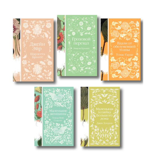 Коллекция элегантной классики — это пронзительная нежность, это сад, который шагнул к вам на книжную полку. Корешки коллекции собирают на полке цветочный орнамент. В комплект вошли «Джейн Эйр», «Вдали от обезумевшей толпы», «Маленькая хозяйка большого дома», «Грозовой перевал» и «Маленькие женщины» — пять классических женских романов, которые приятно читать и приятно дарить.