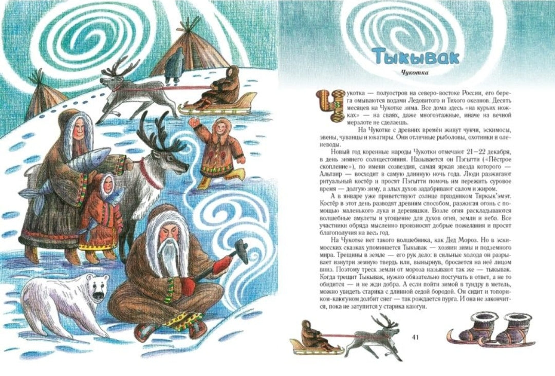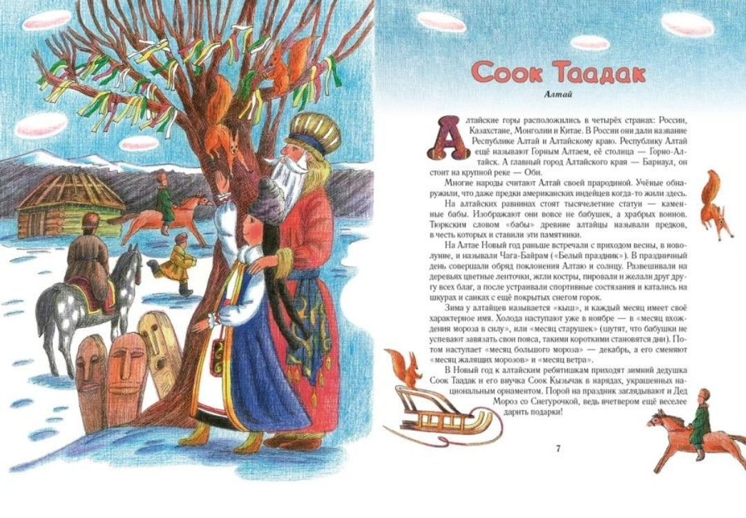 этой книге собрались Деды Морозы со всех уголков России. Каждый из них одет в национальный костюм, имеет свой характер и свои привычки. Но все они управляют холодами и праздничными чудесами, хотя и выбирают для этого разные способы. Кыш Бабай исполняет желания с помощью деревянных бочек, Хёл Мучи - с помощью волшебного сундука, а Ямал Ири использует для волшебства лопатку оленеводов. Писатель Ольга Колпакова и художник Татьяна Гамзина-Бахтий приглашают ребят в гости к зимним волшебникам! В путешествии предстоит узнать, как встречали Новый год в древности и как отмечают его сейчас в разных регионах нашей большой страны.