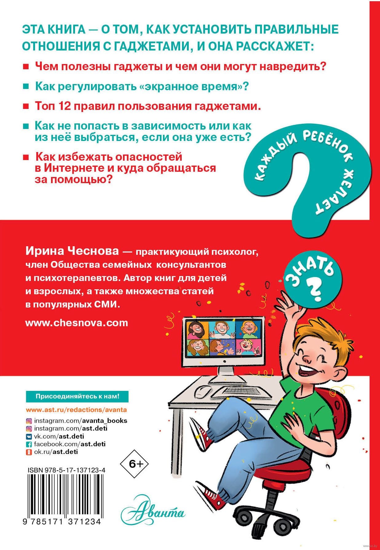 Книга Ирины Чесновой входит в популярную серию "Каждый ребенок желает знать". Эта книга о том, как установить правильные отношения с гаджетами, и она расскажет: