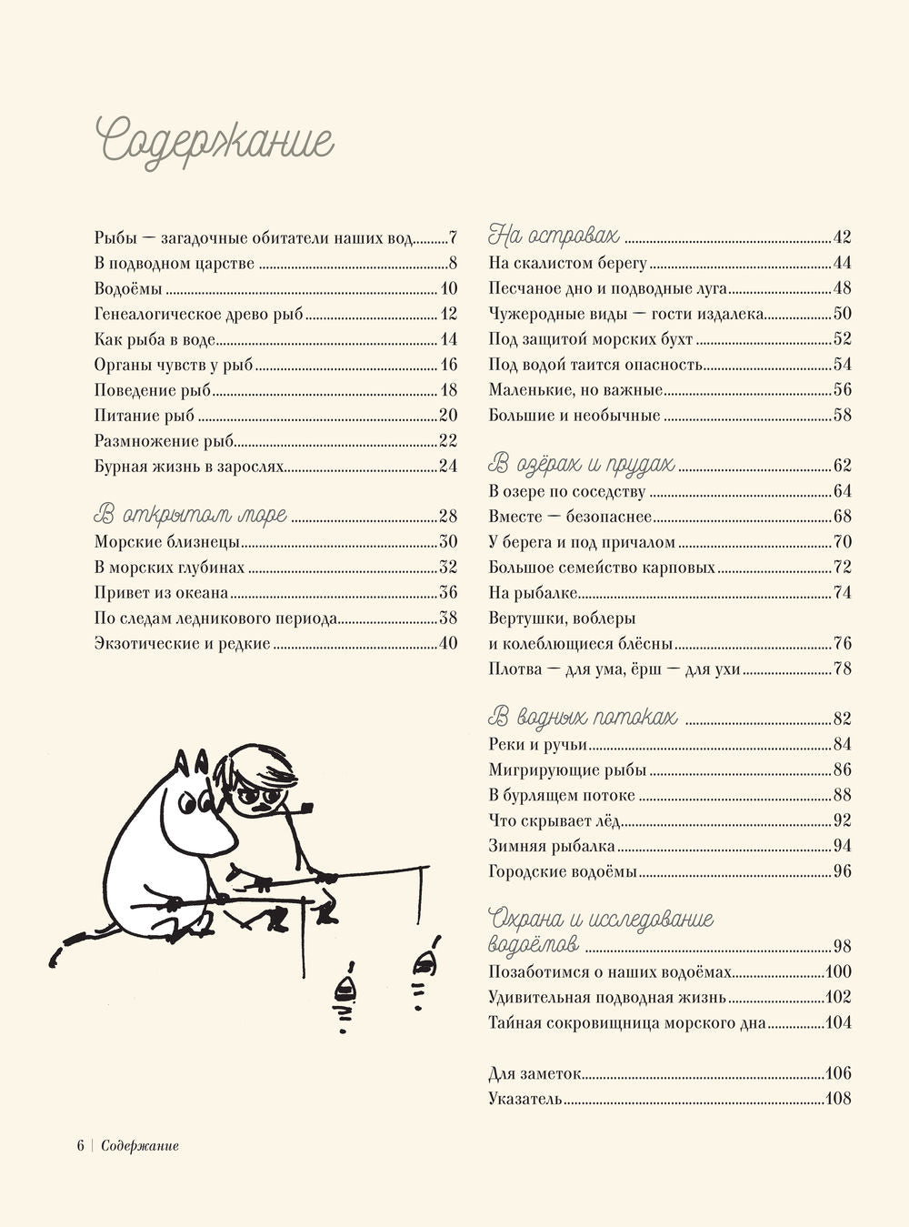 В книге собраны полезные факты и рисунки почти сотни рыб, обитающих в Северной Европе, проиллюстрированные чёрно-белыми рисунками Туве Янссон.