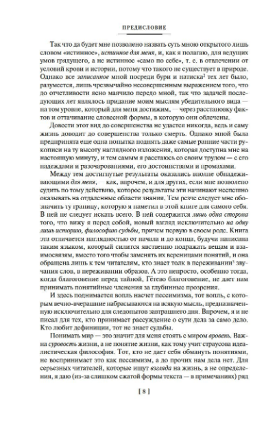 Фигура Освальда Шпенглера (1880-1936) стоит особняком в истории немецкой и мировой мысли. Шпенглер попытался в одиночку переосмыслить общепринятые взгляды на эволюционное развитие человечества: он выступил против линейного описания истории как бесконечного неостановимого прогресса. Вместо этого он предложил концепцию циклического развития, согласно которой новые культуры возникают, переживают период расцвета, а затем проходят через этапы упадка и гибели. Каждый такой цикл длится около тысячи лет, каждая культура обладает отличительными чертами, определяющими мышление и действия людей. Уже само название работы содержит в себе тезис, который обосновывался в книге, – на рубеже XIX-XX столетий культура Западного мира, по мнению Шпенглера, пришла к периоду упадка. Первый том книги был опубликован в 1918 году, принес автору большую известность и вызвал жаркие дискуссии. Эта работа оказала значительное влияние на ученых-социологов Арнольда Джозефа Тойнби, Питирима Сорокина, Хосе Ортегу-и-Гассета.