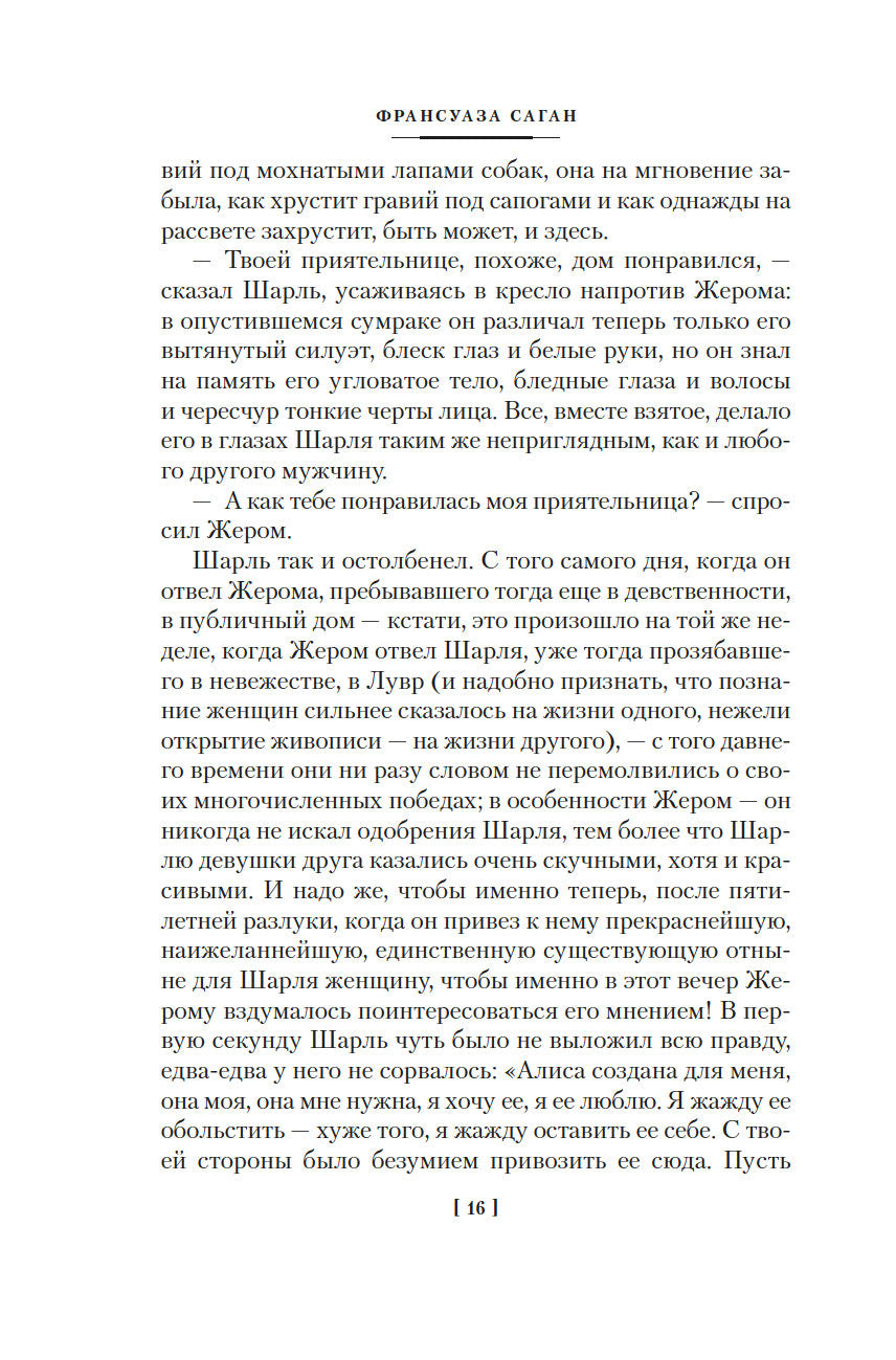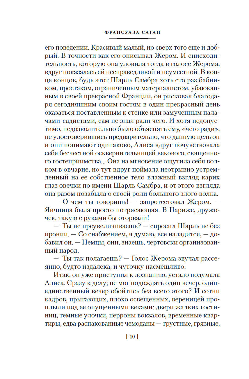 Мадемуазель Шанель от литературы, французский Сэлинджер и Фицджеральд, литературная внучка Колетт, литературная крестница Маргерит Дюрас, скандальная звезда, азартный игрок, прожигательница жизни, тонкий психолог... Франсуаза Саган, прогремевшая с первым же своим романом "Здравствуй, грусть!" (1954), – неизменно свежий голос, кристально честно говорящий о том, что думают и чувствуют живые люди. Книги Саган переводились на десятки языков, их читают и перечитывают миллионы людей по всему миру и увлеченно экранизируют кинематографисты.