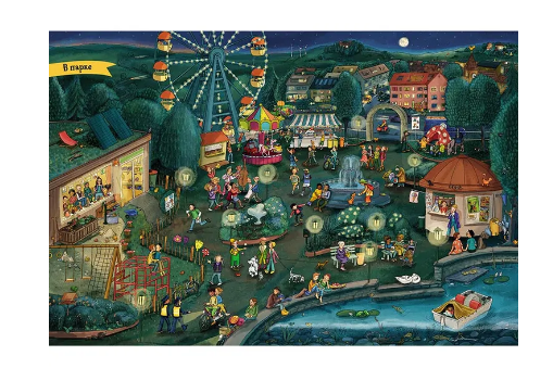 Эти и многие другие истории ждут внимательных читателей вечернего виммельбуха. Вместе с героями книги они смогут прогуляться по залитым огнями улицам города, потанцевать под музыку в парке, побывать в гостях, на ферме и в старинном замке на программе «Ночь в музее».