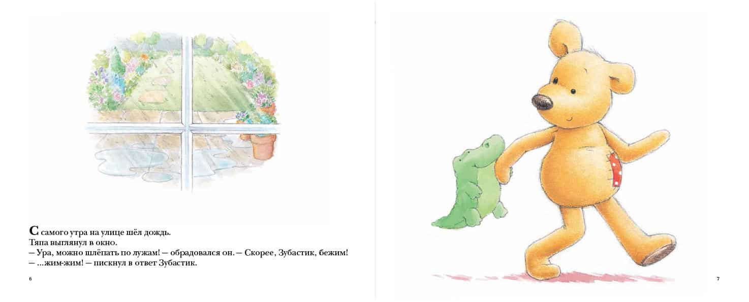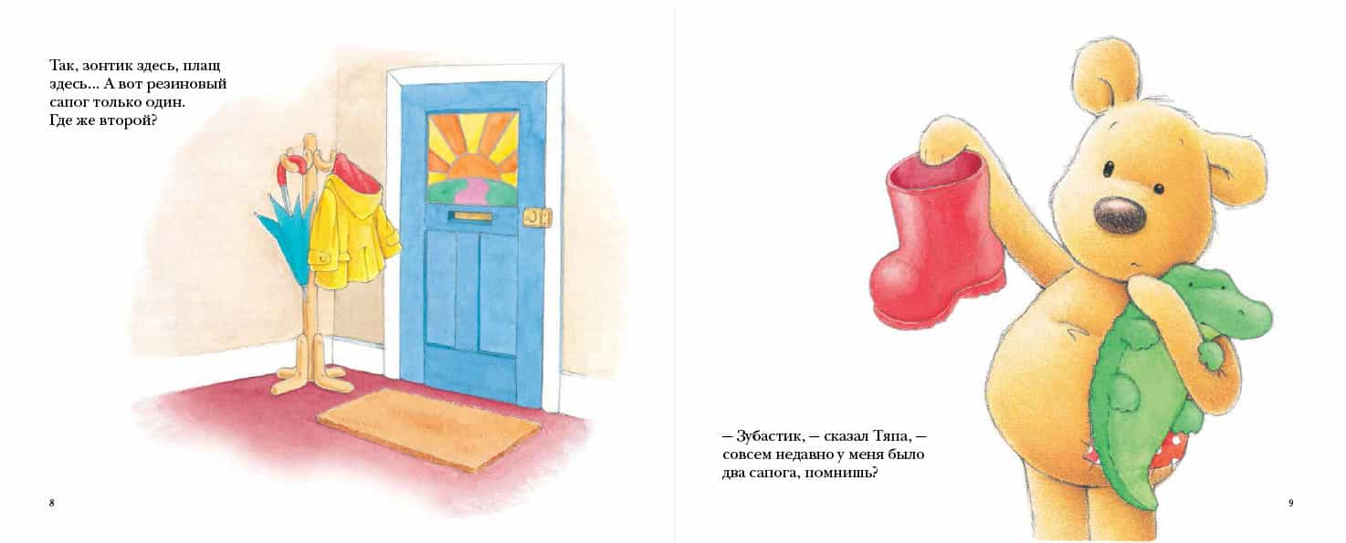 С самого утра на улице шёл дождь, и Тяпа решил отправиться во двор, чтобы пошлёпать по лужам. Но в прихожей он обнаружил только один резиновый сапог. Где же второй? Тяпа перевернул вверх дном весь дом и, в конце концов, нашёл сапог в самом дальнем углу чулана, но умудрился при этом потерять в куче старого хлама нечто гораздо более важное – своего лучшего друга, игрушечного крокодильчика по имени Зубастик. Только разложив все вещи в доме по своим местам и наведя порядок, Тяпа смог отыскать Зубастика и с чистой совестью отправиться на прогулку.