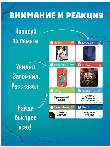 «Штука». Обновленная версия 2024.Вы уже сыграли в игру "Штука. Другие миры" и без ума от нее? Тогда попробуйте эту "Штуку" с ее новыми потрясающими игровыми полями! Это все та же веселая и необычная смесь импровизационных игр и книжек-пряталок (виммельбухов) с запутанными картинками. Объясни жестами, рисунками, словами, отгадай и найди ответ на картине быстрее всех! Ведущий берет карточку, на которой загадано то, что нужно объяснить. Однако в "Штуке" загадано не слово, а фрагмент большой картины, на которой настоящая куча-мала разных деталей, сюжетов и существ. Нужно поскорее понять, что имеется в виду, и отыскать ответ на игровом поле. Тот, кто отгадает и найдет загаданное, должен как можно скорее схватить Золотую Штуку! Если вы первым схватили Штуку и ваш ответ оказался верным, ваша фишка идет вперед. А если игрок схватил Штуку, но ошибся, его фишка пойдет назад! Тот, чья фишка уйдет дальше всех в ходе партии, становится победителем. В игру входит 8 игровых полей-картин, созданных современными российскими художниками. На каждом из них загадано 90 "штук". Загадок хватит не менее чем на 24 партии. Можно играть втроем, но чем больше игроков, тем лучше. Можно играть командами. Детям до 12 лет можно играть вместе со взрослыми (правила можно немного упростить при необходимости). Поля для игры с детьми должны быть отобраны родителями.