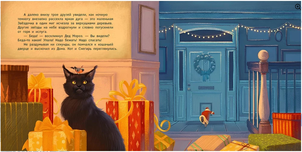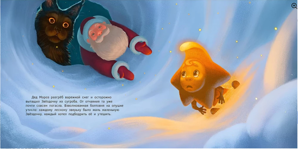 Перед Новым годом у Деда Мороза было много забот. Он пересчитал подарки, навёл порядок на ёлке и, собрав друзей — Снегиря и Кота, стал наблюдать за снежинками и звёздами в окно. Вдруг ночное небо озарила яркая дуга: маленькая Звёздочка, сверкнув, исчезла за деревьями. Друзья без промедления отправились её спасать!