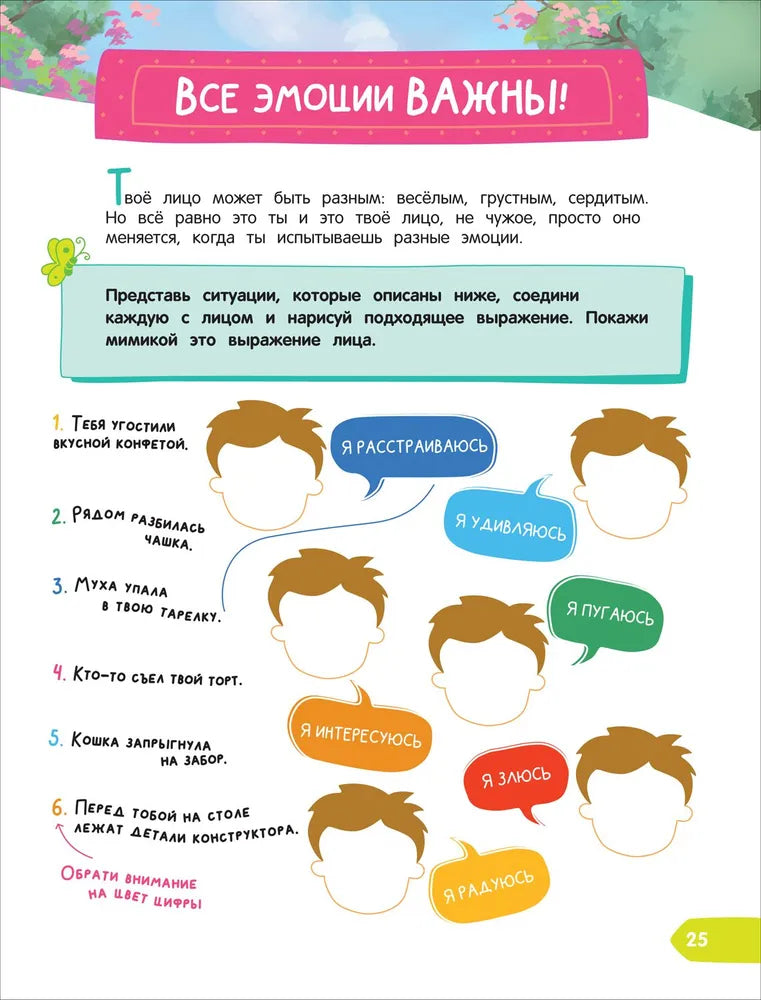 Тренажер-практикум поможет дошкольнику в игровой форме развить навыки общения и рассказывания, поможет понять и усвоить, какие эмоции бывают и как ими управлять, научит выражать свои эмоции и быть гармоничным, а также понимать эмоции других людей.
