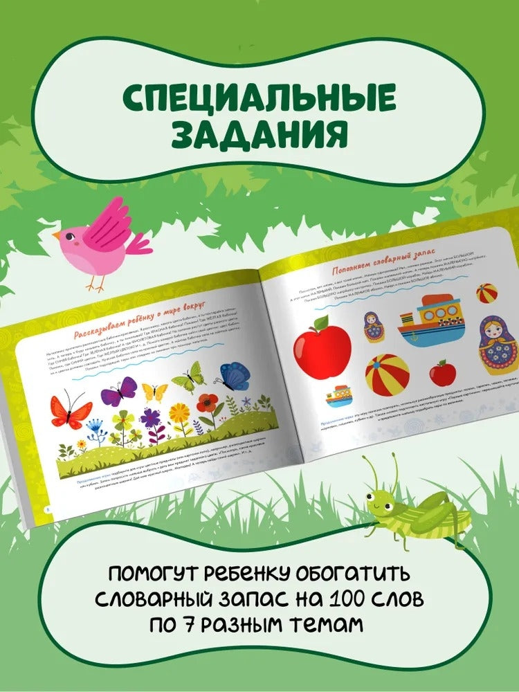 • специальные задания, которые помогут ребёнку обогатить свой словарный запас на 100 слов по 7 разным темам;