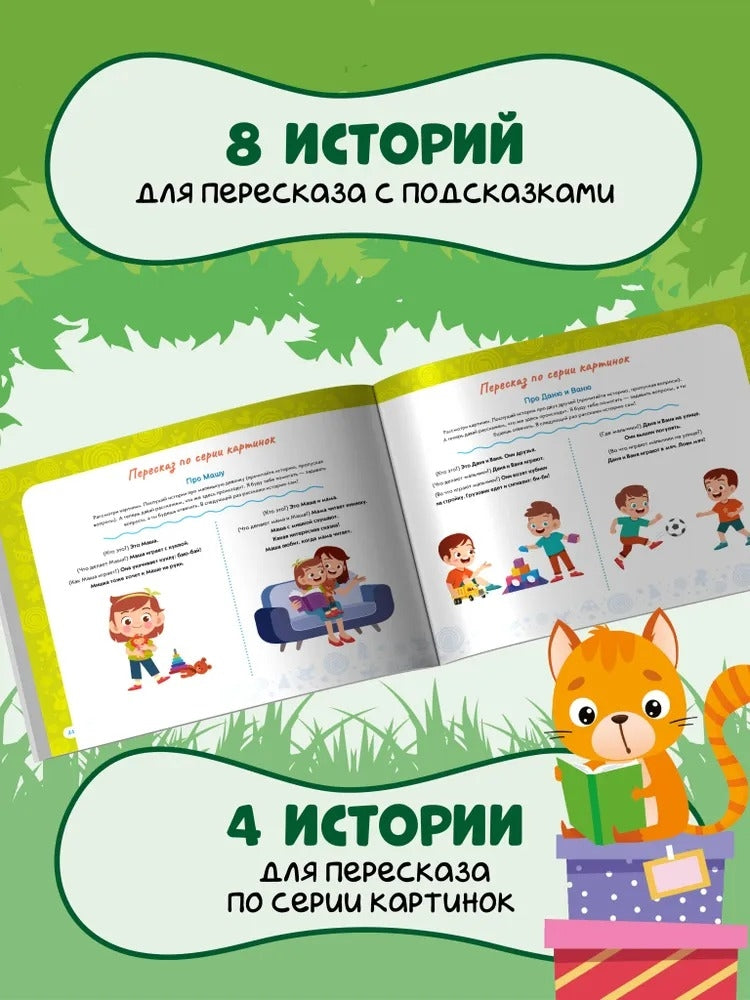 • 8 историй для пересказа с подсказками, 4 истории для пересказа по серии картинок;