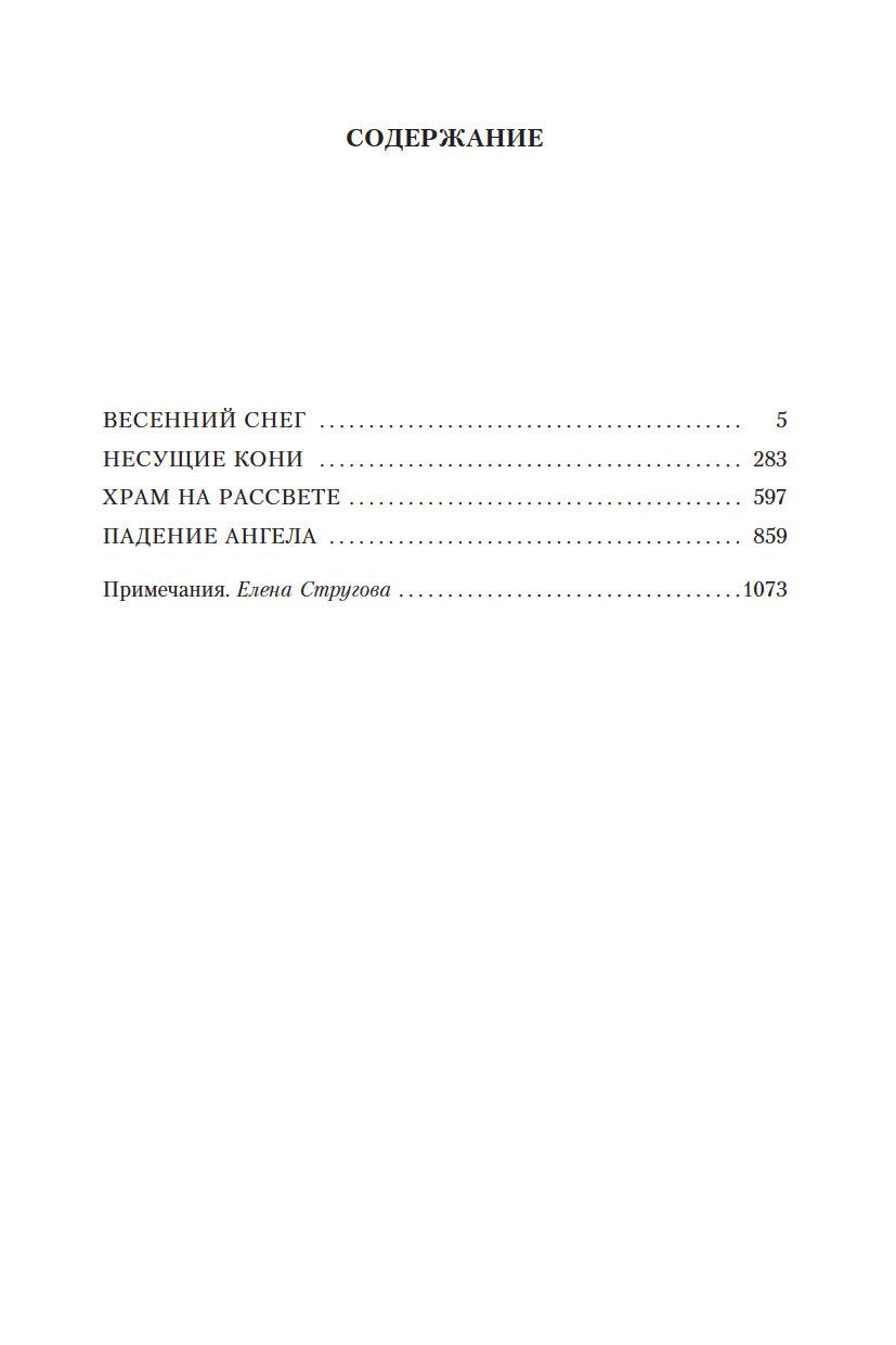 Юкио Мисима — самый знаменитый и читаемый в мире японский писатель. Прославился он в равной степени как своими произведениями во всех мыслимых жанрах (романы, пьесы, рассказы, эссе), так и экстравагантным стилем жизни и смерти (харакири после неудачной попытки монархического переворота). Тетралогия «Море изобилия» — это вершина сочинительства Мисимы и своего рода творческое завещание; это произведение, в котором Мисима, по его словам, «выразил все свои идеи» и после которого ему уже «не о чем было писать». Завершив последний роман тетралогии, он поставил точку и в своей жизни. «Море изобилия» содержит квинтэссенцию собственной эстетической системы Мисимы, сочетающей самурайско-синтоистские элементы с образами европейской античности, влиянием эзотерического буддизма и даже индуизма. Краеугольным камнем этой эстетики всегда оставалась тема смерти и красоты; герои Мисимы стараются постичь страшную и неопределимую загадку красоты, которая существует вне морали и этики, способная поработить и разрушить человеческую личность. Сюжет «Моря изобилия» основан на идее реинкарнации, последовательно раскрывающейся через историю трагической любви, идеалистического самопожертвования, мистической одержимости, крушения иллюзий…