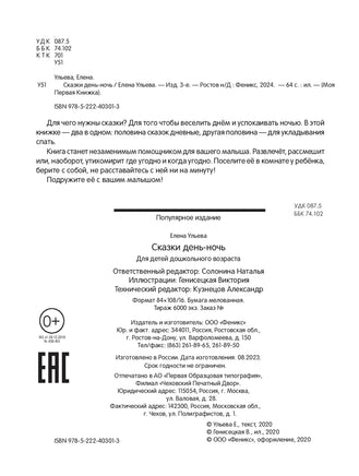 Для чего нужны сказки? Для того чтобы веселить днём и успокаивать ночью. В этой книжке – два в одном: половина сказок дневные, другая половина – для укладывания спать. Книга станет незаменимым помощником для вашего малыша. Развлечёт, рассмешит или, наоборот, утихомирит где угодно и когда угодно. Поселите её в комнате у ребёнка, берите с собой, не расставайтесь с ней ни на минуту! Подружите её с вашим малышом!